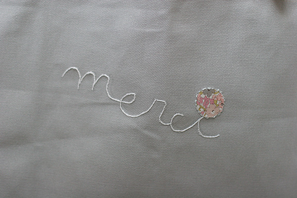 新作のスクールバッグは、これまでのものよりも、余計なものを省き、でも手作りのかわいさをたっぷりと味わえるように刺繍とアップリケ。mdotのmからmerci にしました。