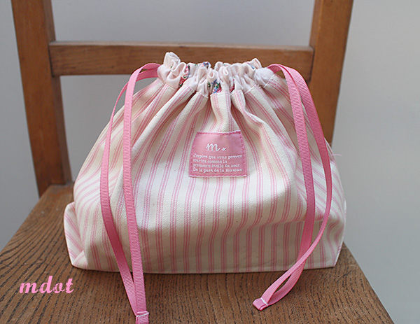 すこししっかり目のストライプは、ヘリンボーン。紐はピンクのグログラン。